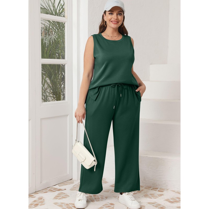 XIEERDUO Women's 2 Piece Summer Outfits 2 Pc Spring Lounge Sets Sleeveless Crewneck Wide Leg Tracksuit Casual Clothing Green Vacation Clothes M