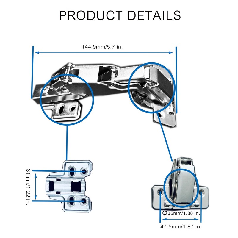 - Details: the opening angle is 165 degree, the Cup diameter is 35mm/1.38 in, and the Cup depth is 11.3mm/0.445 in, Screw holes distance is 47.5mm/1.87 in.