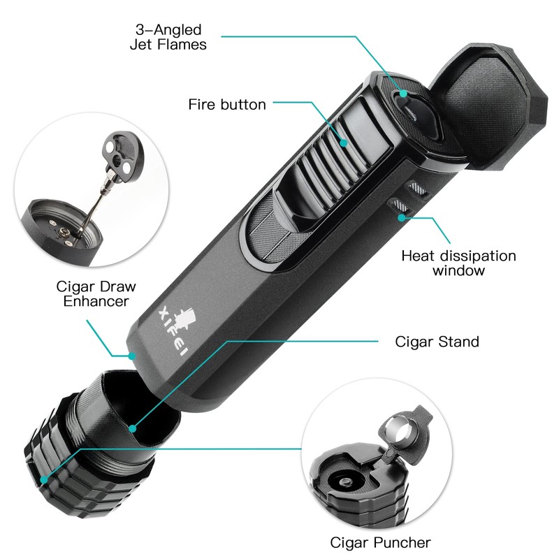 XIFEI Cigar Lighter 3-Angled Jet Flames, Cigar Puncher, Cigar Draw Enhancer, Cigar Stand, 4-in-1Refillable Butane Torch Lighter (Sand Black)