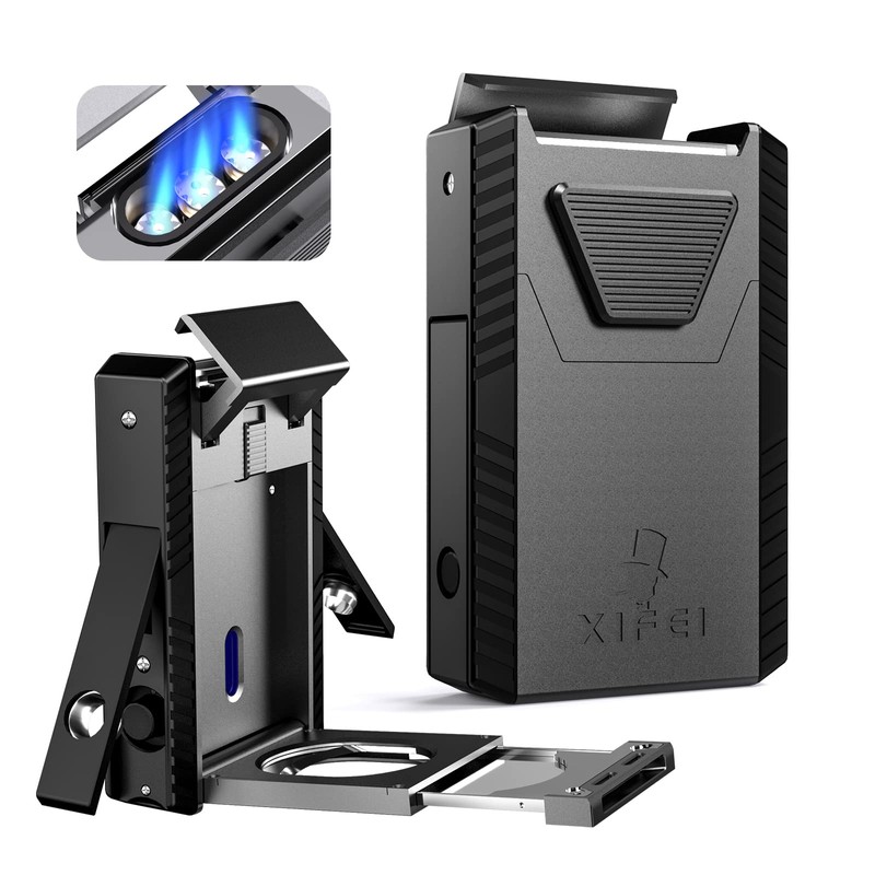 XIFEI Cigar Lighter Triple-Jet Flame, with Integrated Cigar Puncher and Double-Blade Cigar Cutter (Black)