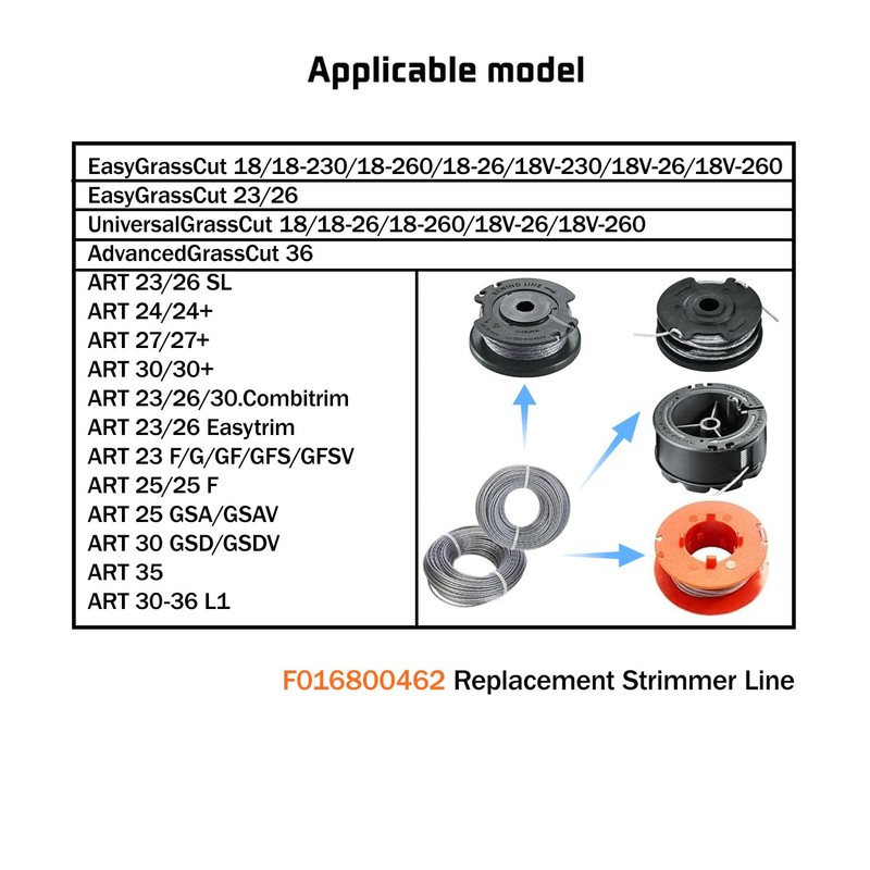 Compatible with bobbin model: Bosch ART 30-36, ART 24, ART 27, ART 30, EasyGrassCut 23, EasyGrassCut 26, EasyGrassCut 18,18-230, 18-260, 18-26, BOSCH UniversalGrassCut 18, UniversalGrassCut 18-26, AdvancedGrassCut 36.
