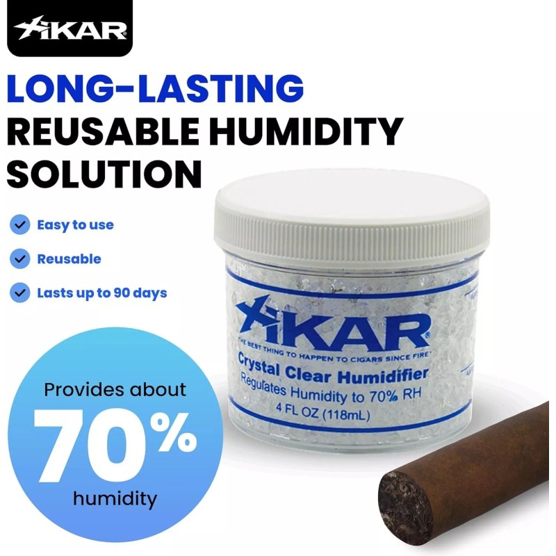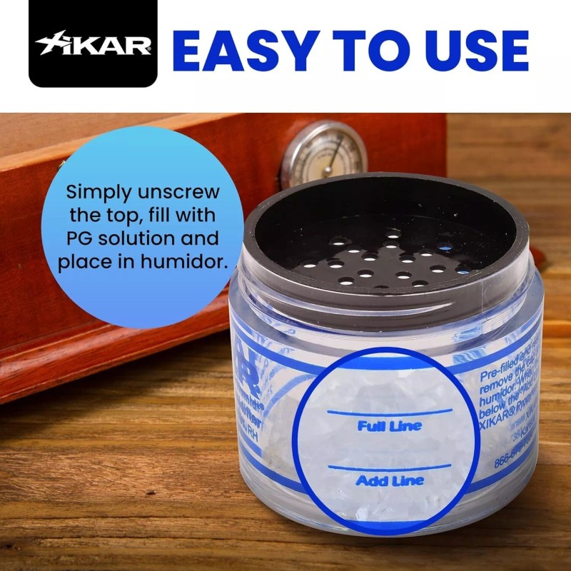 The crystals in the Xikar 808Xi humidification jar provide steady humidification of 70% that lasts up to 90 days before needing to be refilled. The jar regulates humidors that store up to 150 cigars. The crystals will shrink slowly as water evaporates over time. Recommended to refill with Xikar pre-mixed PG solution (sold separately). The slow, steady release of constant humidity of 70% ensures the protection your cigars need. For larger humidors additional jars may be used.