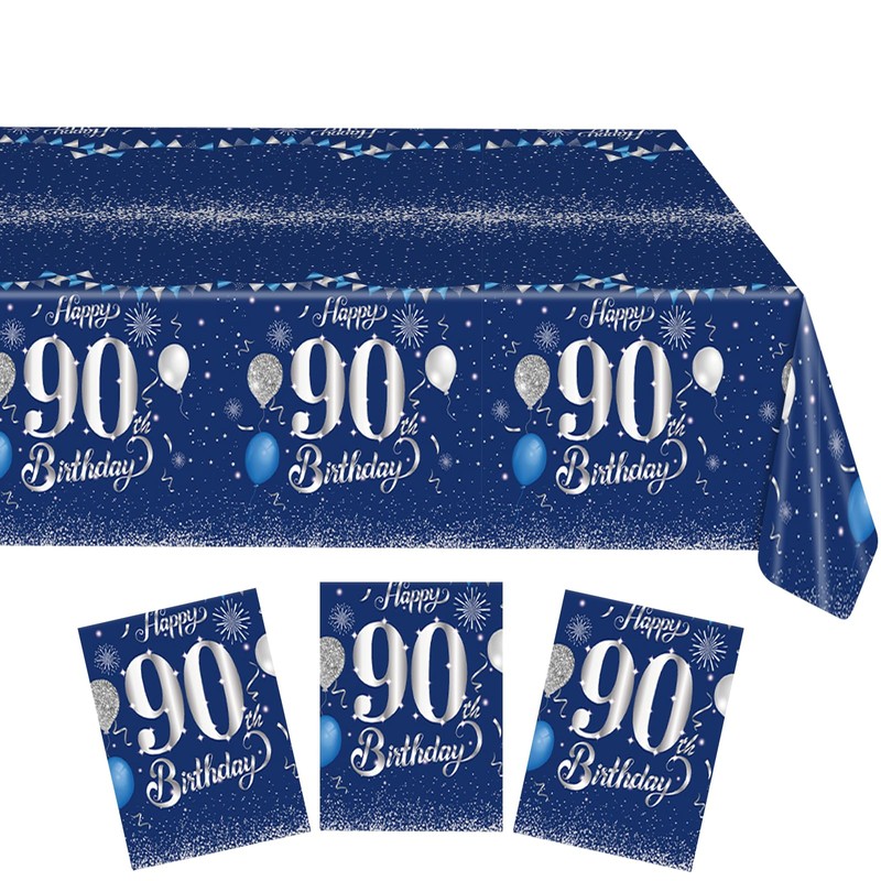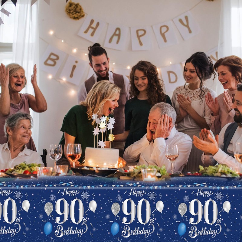 - Exquisite Patterns: Blue and silver table cloths use blue and silver as the theme colors, which are beautiful and dazzling.The tablecloth featured sparkling diamonds, bursts of fireworks, silver foil, and blue and white balloons surrounding the words "Happy 90th Birthday". Blue 90th birthday decorations will give you an unforgettable birthday party experience.
