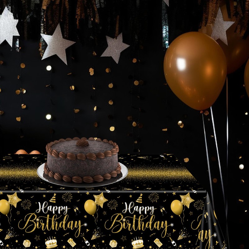 - Exquisite Design: Black and gold table cloths uses classic black as the background color, and the eye-catching gold looks very attractive, highlighting your unique taste.Black table cloths is full of birthday-themed elements, such as cakes, balloons, gift boxes, etc. The large font "Happy Birthday" will firmly grab the attention of your relatives and friends and leave a deep impression on them.