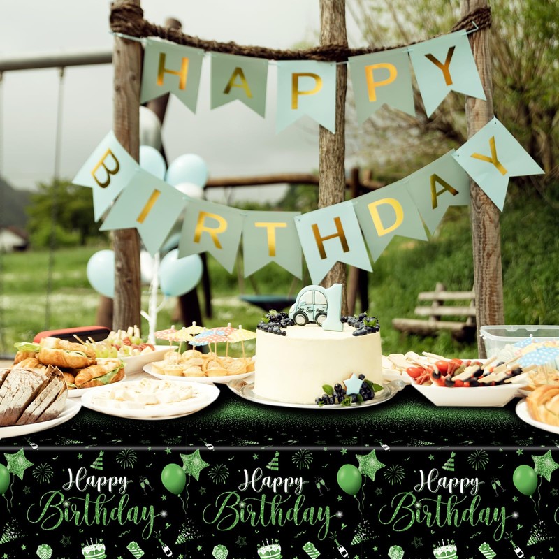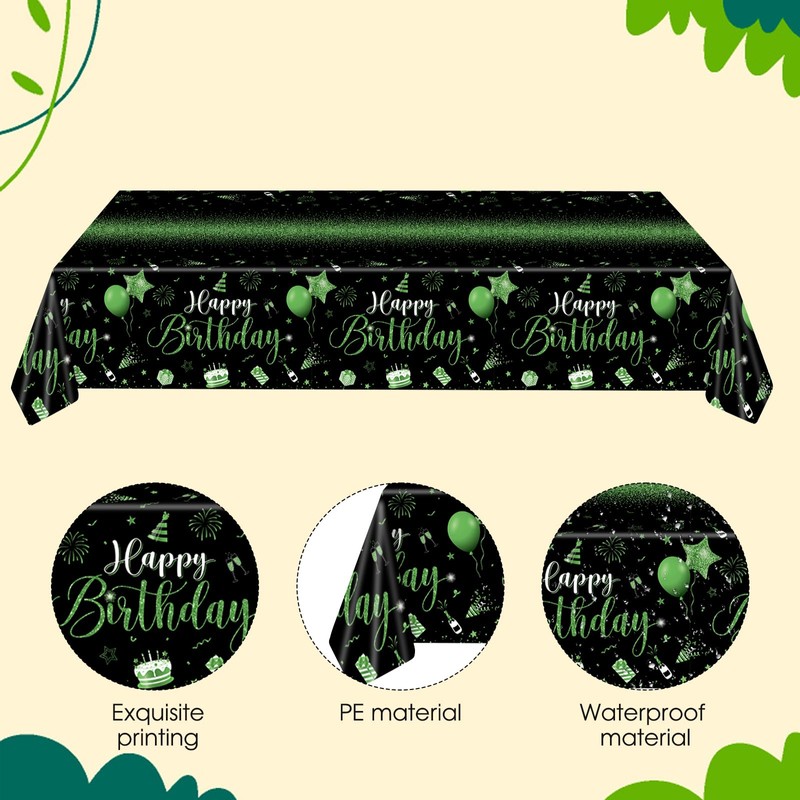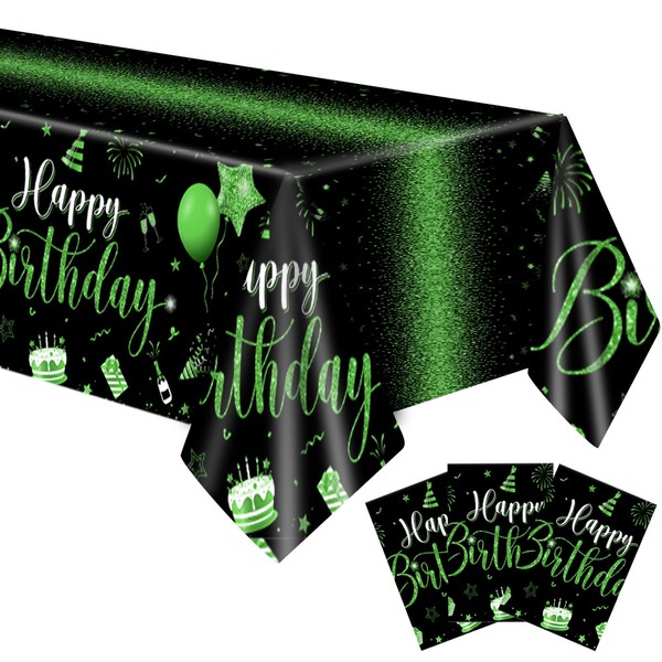 Xiliconie 3PCS Happy Birthday Tablecloth Green and Black Tablecloth Disposable Rectangle Table Decorations for Men Women Birthday Baby Shower Wedding Anniversary Holiday Party Decorations