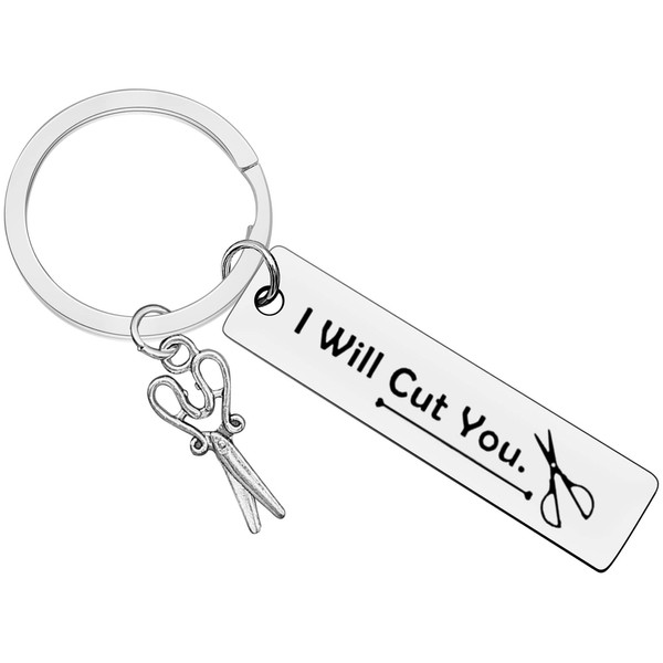 - Hairdresser Keyring: Engraved with: “I Will Cut You”. This keyring make the ideal gifts for hair stylists, cosmetology students, barber or hair stylist.