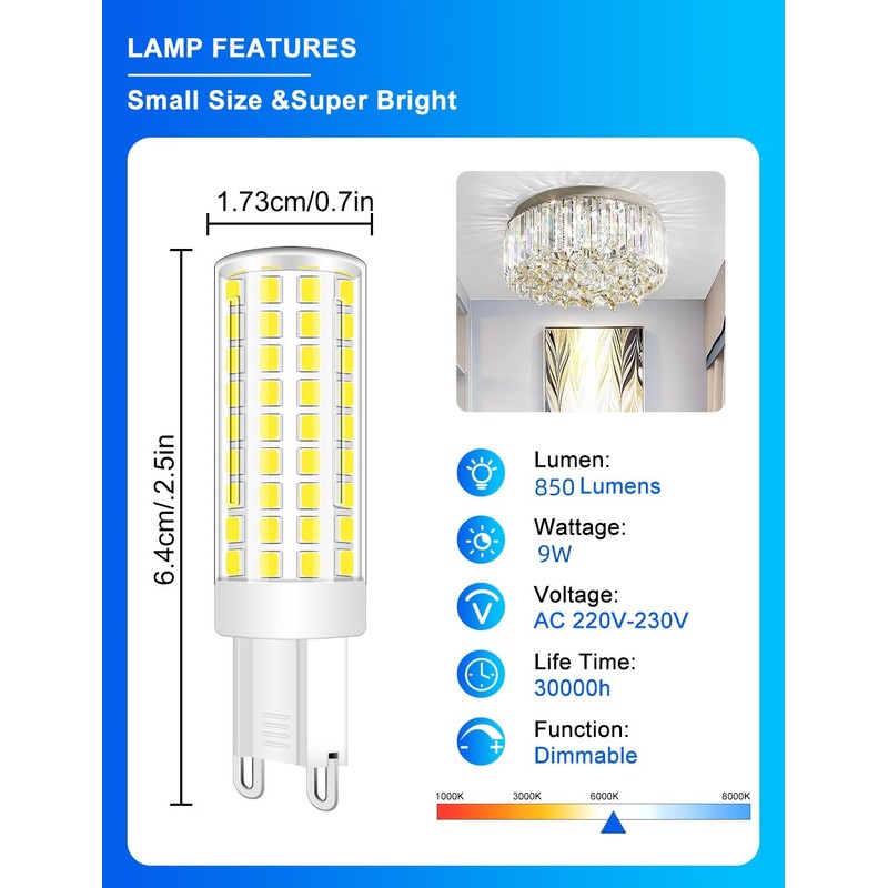 • 💡【ENERGY SAVING】- This 9W g9 LED bulb produces as much or more light than a 60W-80W halogen lamp and save 90% energy. With a luminous flux of 850LM. The LED Chips are specially designed for less energy consumption and less heat dissipation.