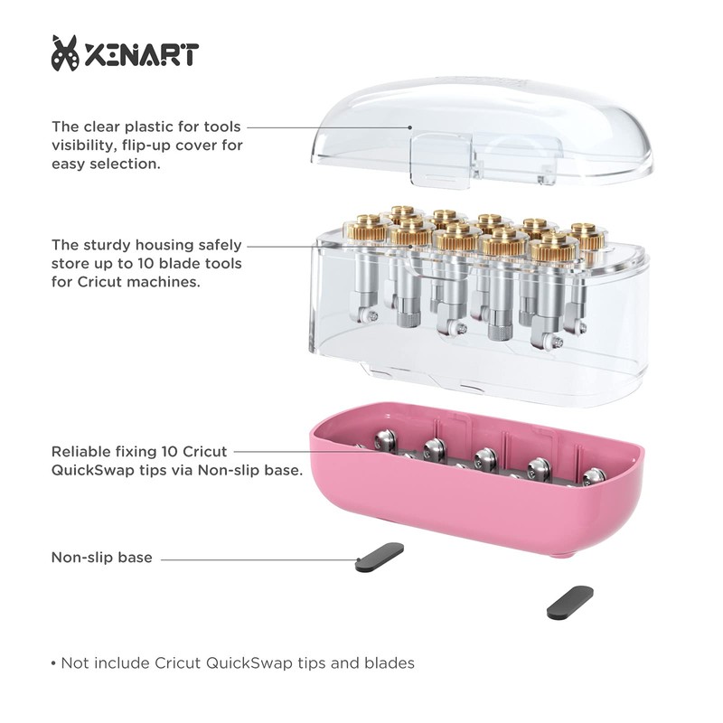 - Xinart tool holder is very well made and sturdy! There are non-slip bases at the bottom of the box, which can ensure the stable placement of the blade organizer. The upper compartment is a flip-top. The lower compartment can be opened by sliding horizontally. Use xinart blade organizer for cricut to store blades, you can see every tool clearly with clear plastic casing.