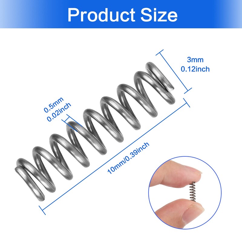 - Specifications: Our compression spring has a wire diameter of 0.5 mm, the outer diameter of 3 mm and the total length of 10 mm.