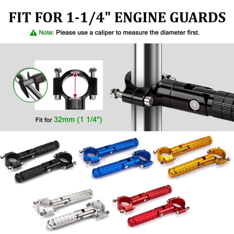 - Easy Installtion: These highway pegs clamp directly onto 1-1/4" engine guards with the included mounting hardware. Simple bolt-on installation with an adjustable angle to match your preferred riding posture