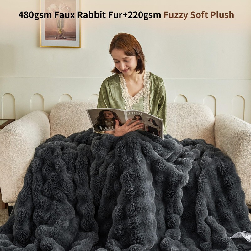 - Premium Faux Rabbit Fur: 480gsm Faux Rabbit Fur + 220gsm Fuzzy Soft Plush. The fabric boasts an ultra-soft texture, being thicker than conventional blankets, thereby it can providing you with a warmer and more luxurious user experience. We upgraded the heating wire so you can hardly felt during use, start to enjoy this premium heated blanket