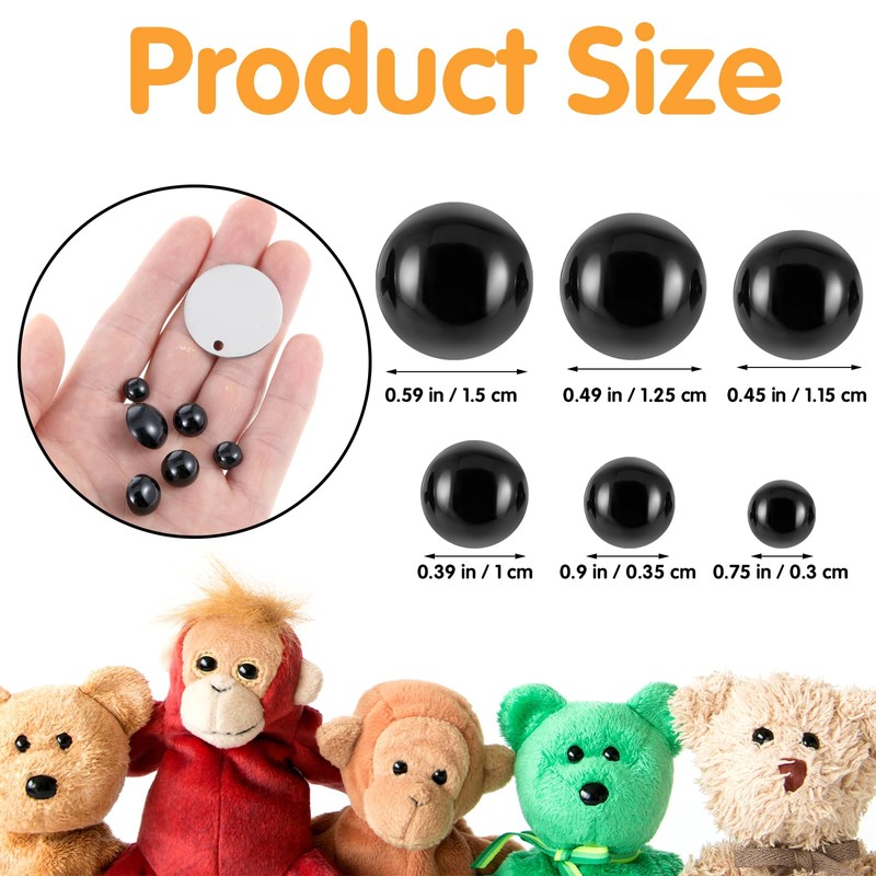 Specifications:Name: Doll accessoriesColor: BlackMaterial: PlasticFunction: Very suitable for handmadeProduct size: 0.30 inches / 0.75 cmProduct size: 0.35 inches / 0.9 cmProduct size: 0.39 inches / 1 cmProduct size: 0.45 inches / 1.15 cmProduct size: 0.49 inches / 1.25 cmProduct size: 0.59 inches / 1.5 cmPacking size: 24 16  1.7 cmPacking method: BagGross weight: 106gPacking list:70 10/9/7.5/mm + 50 11.5mm + 30 12.5mm + 10 15mm, a total of 300