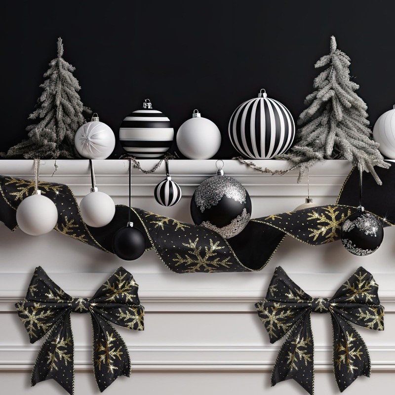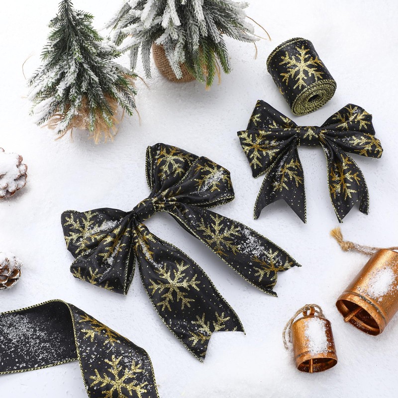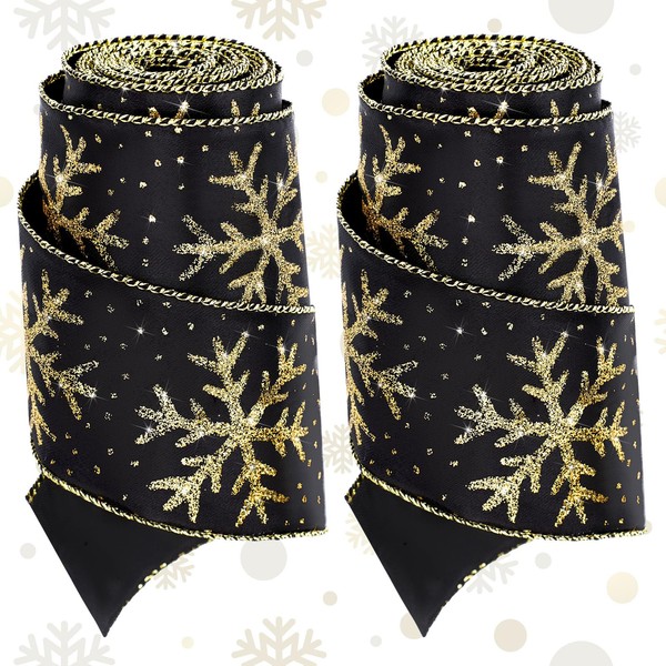 Xinnun Christmas Snowflake Wired Ribbon 2.5 Inches 2 Rolls Satin Glittered Snowflake Wired Edge Ribbon Christmas Ribbon for Tree Gift Wrapping Home Decorations Bow DIY Craft (Black,Gold,12 Yard)