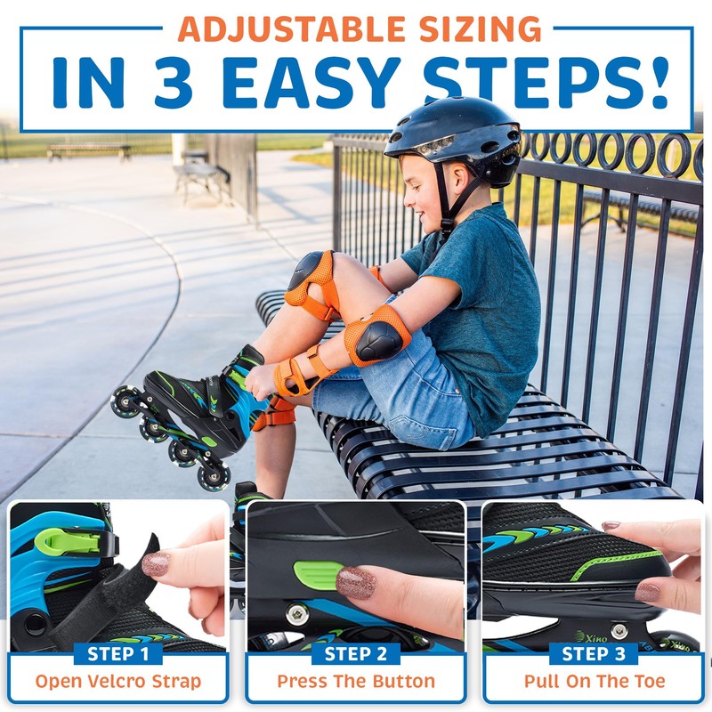 - EASY TO ADJUST SIZING: We know how fast your kid’s feet grow, that’s why we made our premium roller skates & inline skates 2 in 1 combo with adjustable sizing! To adjust the inline skate sizing as their feet grow to provide an exact fit for years of inline skating pleasure open the strap, press the button on side, and pull on the toe to expand. Choose from our 3 popular sizes Youth Medium (size 1-4), Youth Large (size 5-8) and Adult XL (size 9-12)