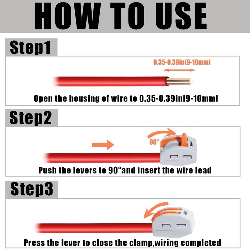 - Easy to use:You can connect wires without any tools. Push the orange handle to 90 °, insert the wire, and place the back of the wire clamp,only need a little power to push the lever up