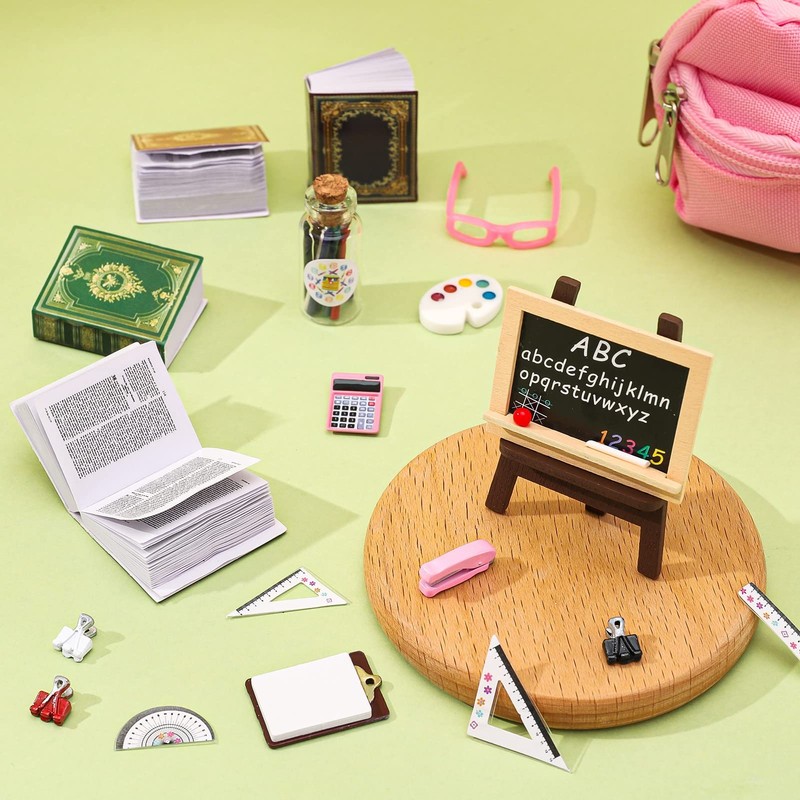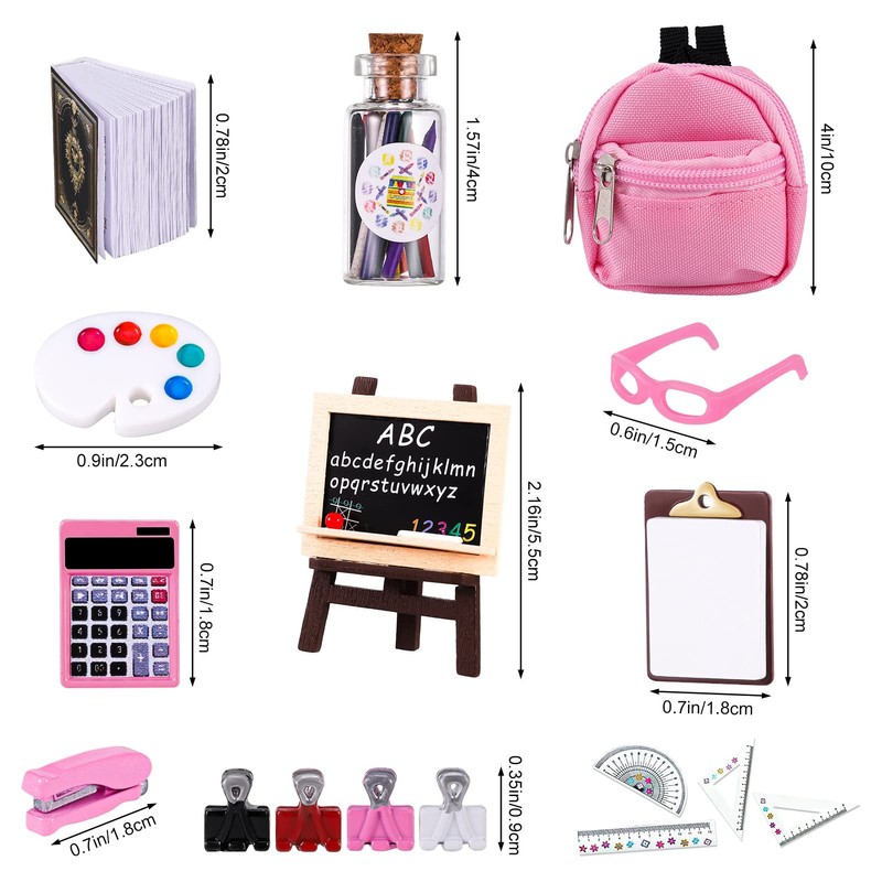 - Set: Contains 4 miniature books, 4 clips, 4 rulers, 1 glasses, 1 calculator, 1 school bag, 1 blackboard, 1 palette, 1 stapler, 1 notepad, 1 bottle of pens, enough accessories to complement your look.