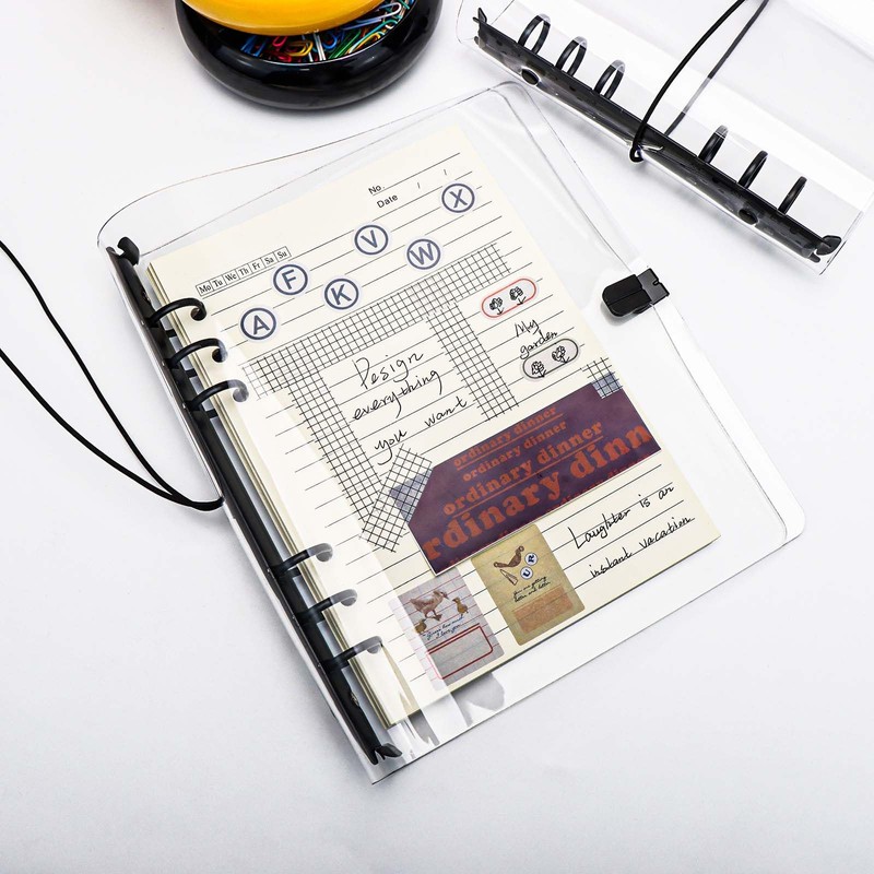 - 💗【MATERIAL】A5 binder 6 ring is made of PVC material, cames with 6 black round rings and a black elastic cord. Clear, sturdy and flexible, it is easy to see the first page of the notebook with transparent design.