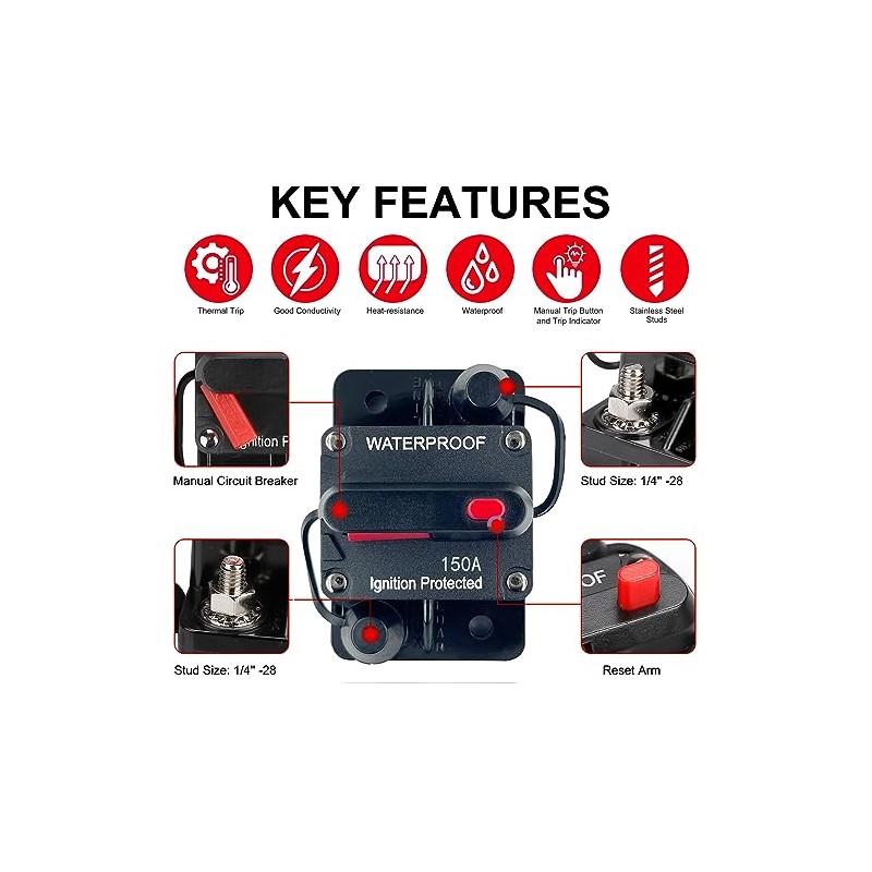 Features:Easy to operate with manual reset arm.good conductivity, high temperature resistance.Mount on Panel or FirewallStops Power Surges from Damaging Your AmpsSplash and dust proof Water proofNo need to keep replacing fuses anymore, simply reset breaker and you are ready to go.Protects Your Trolling Motor From Electrical DamageUnique Push Button Reset can also be used as a Kill SwitchApplication:Suitable for car audio/video system, Boat, trucks, buses, RV's, ATV Winches and marine and DC sound amplifier system overload protection.Specification:1. Size: 2.9in (L) x 1.96in (W) x 1.85in (H).2. Voltage: 12-48V DC3. Net weight: 3.1oz4. Operating temp: -32C to 82C (-25F to 180F).5. Material: Plastic and Metal6. Ampere range:300A7. modes: Close/OffPackage included:1PCx 150Amp Waterproof Circuit Breaker