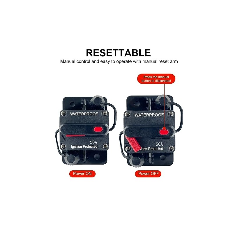 Features:Easy to operate with manual reset arm.good conductivity, high temperature resistance.Mount on Panel or FirewallStops Power Surges from Damaging Your AmpsSplash and dust proof Water proofNo need to keep replacing fuses anymore, simply reset breaker and you are ready to go.Protects Your Trolling Motor From Electrical DamageUnique Push Button Reset can also be used as a Kill SwitchApplication:Suitable for car audio/video system, Boat, trucks, buses, RV's, ATV Winches and marine and DC sound amplifier system overload protection.Specification:1. Size: 2.9in (L) x 1.96in (W) x 1.85in (H).2. Voltage: 12-48V DC3. Net weight: 3.1oz4. Operating temp: -32C to 82C (-25F to 180F).5. Material: Plastic and Metal6. Ampere range:300A7. modes: Close/OffPackage included:1PCx 50Amp Waterproof Circuit Breaker