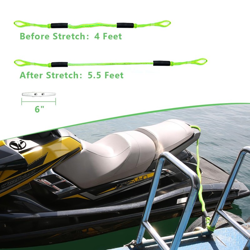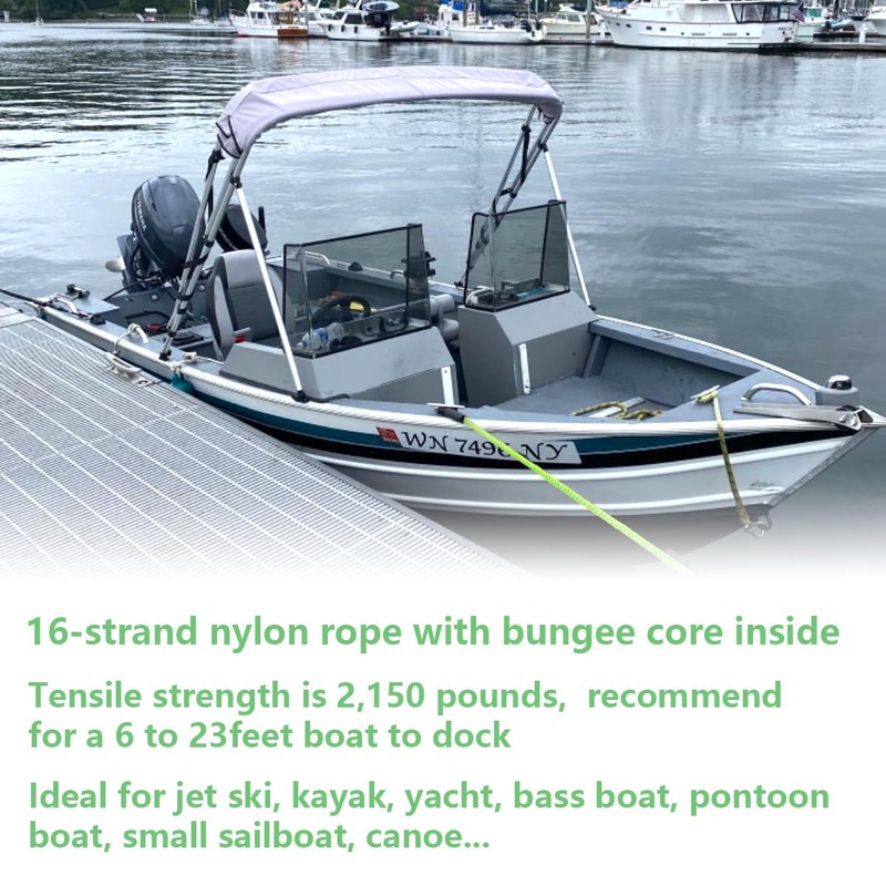- Favourable Elasticity and Tension -- The boat bungee dock Lines can be stretch from 4 feet to 5.5 feet. Compared to a regular ropes, these bungee ropes allow flex as the water motion happens and also keep your boat from bouncing around since they have continual tension from the bungee. The dock ropes are able to hold 2,150 pounds of tension, which is roughly a 23 foot regular boat.