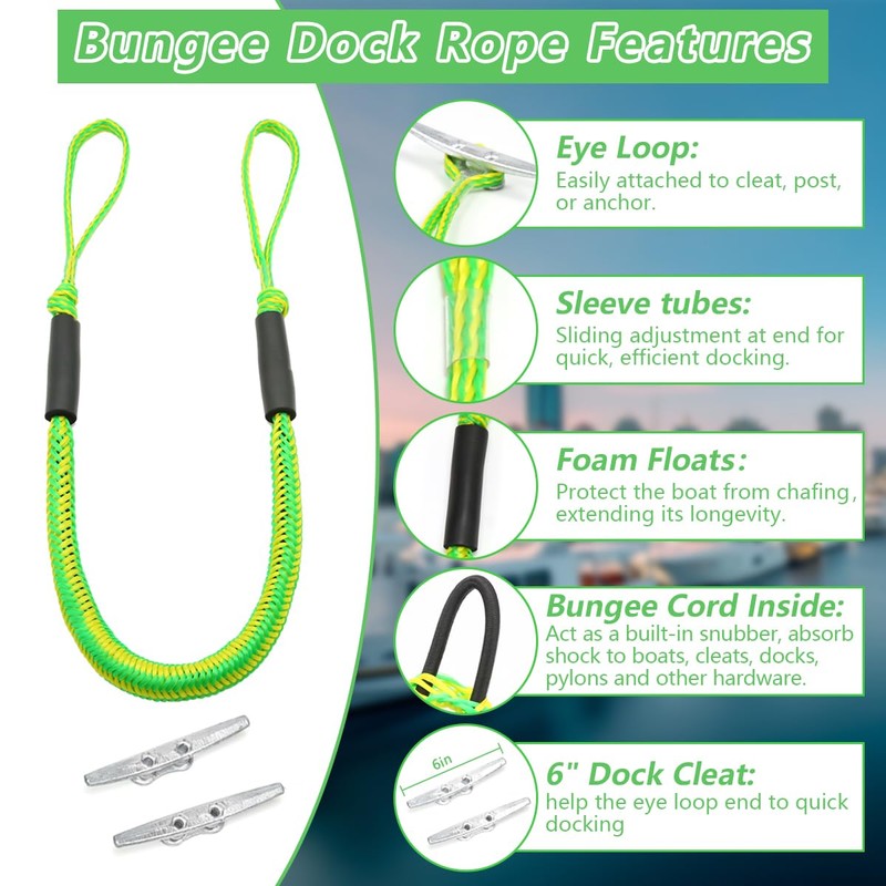 - Unique Design -- The boat line are strong woven poly fibers inside with a bungee cord witch acts as a built-in snubber, sufficiently stretchy can help roll with the waves on a windy day, absorbing shock to boats, cleats, docks, pylons and other hardware. Foam floats help to protect the boat from chafing.
