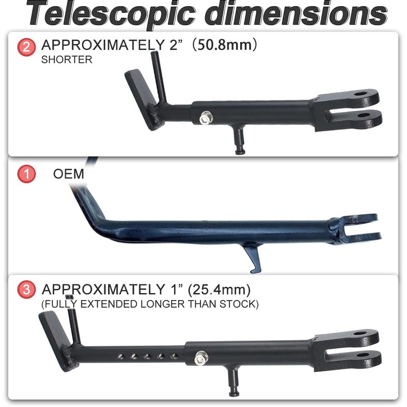• Adjustment Design: The adjustable bracket allows you to shorten the kickstand while lowering your vehicle without having to worry about replacing stock support.