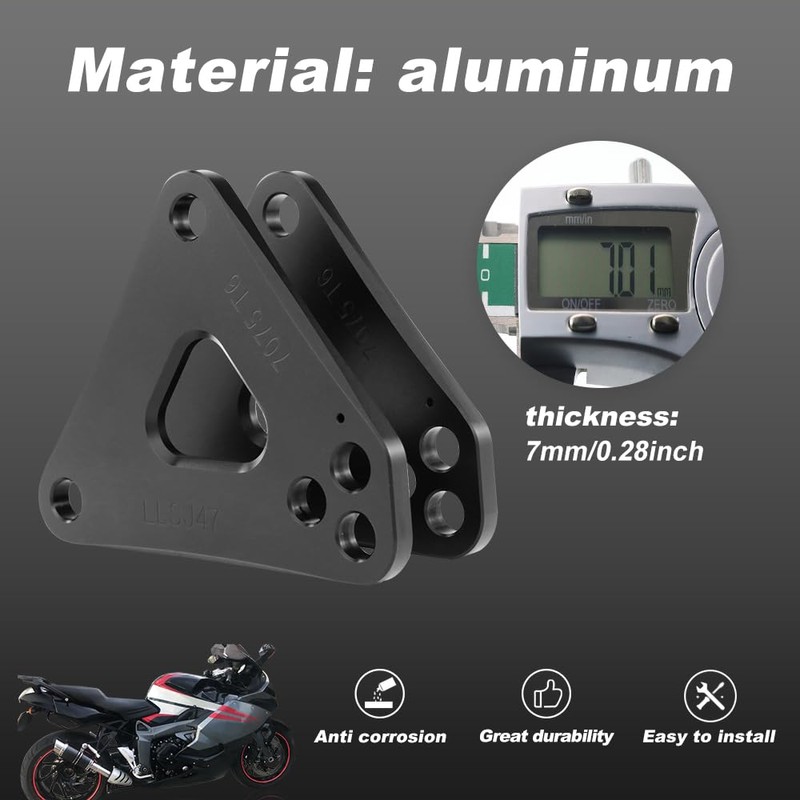 - Robust Construction with 7mm Thickness: The motorcycle lowering kit's 7mm thickness 7075-T6 aluminium ensures structural integrity and durability for reliable performance in diverse riding conditions.