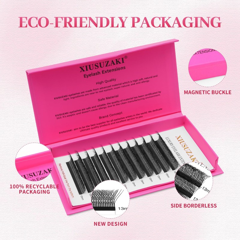 XIUSUZAKI is mainly engaged in eyelash extensions and related products. Double Tips 5D W Lash Extension Supplies Thick w lash 0.07 C/D curl Mix Tray 8-15 mm Premade Fans Russian Volume Faux Mink Matte