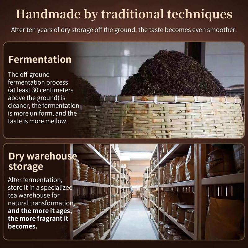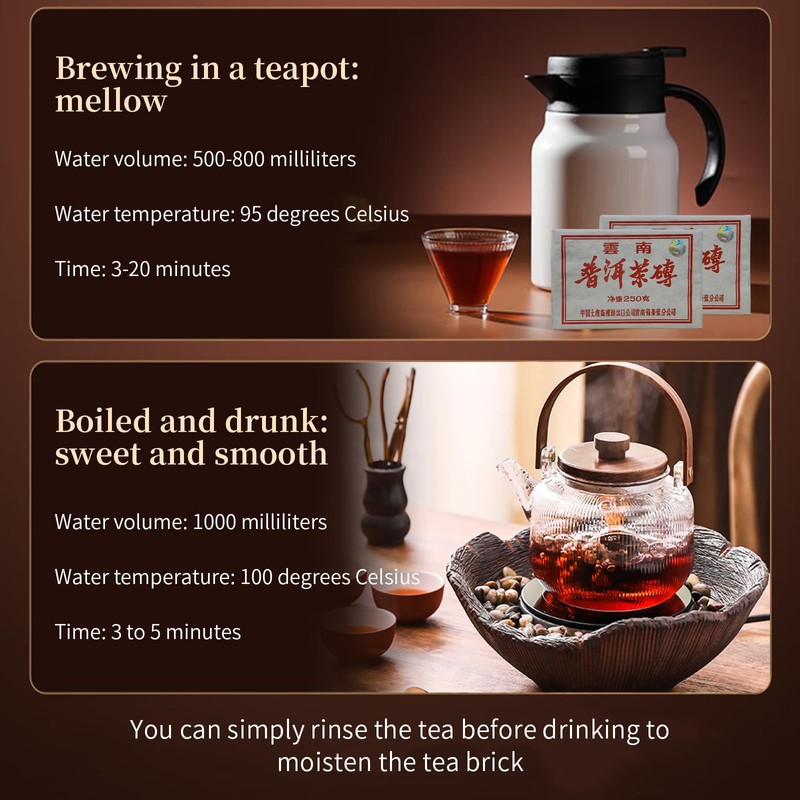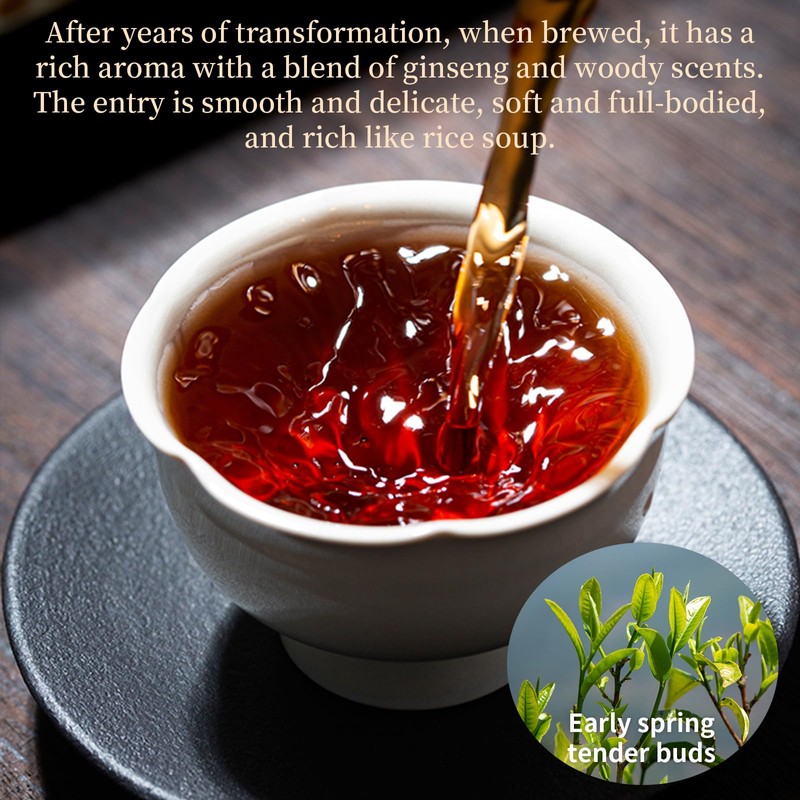 - Please note: The date on the tea brick is the raw material date, not the expiration date. Pu 'er tea can be stored for a long time in a dry, well-ventilated and dark environment. The substances contained in tea bricks continue to transform, and the taste and aroma improve year by year. Its raw materials, craftsmanship, taste, appreciation and collection value together constitute a unique symbol of tea culture, which is worthy of in-depth exploration and collection by tea enthusiasts.