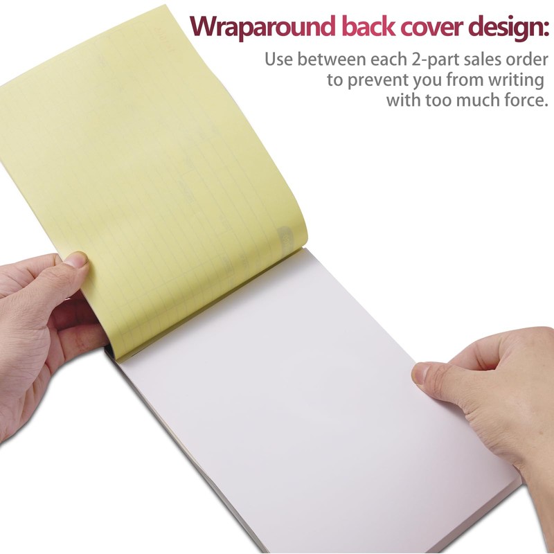 - Wraparound Divider Flap: A thick folded cardboard divider is integrated into the back of each invoice book for use between each two-part sales order to prevent the written content from rubbing off on subsequent copies of the invoice, resulting in wasted invoices.