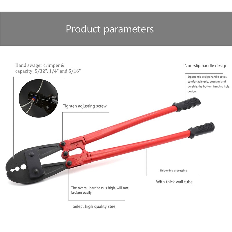 - 【CRIMPING & CUTTING】 Our hand swager crimper is an ideal tool for crimping. Wire rope dia in capacity: 5/32", 1/4" and 5/16" Aluminum/Copper Sleeves.