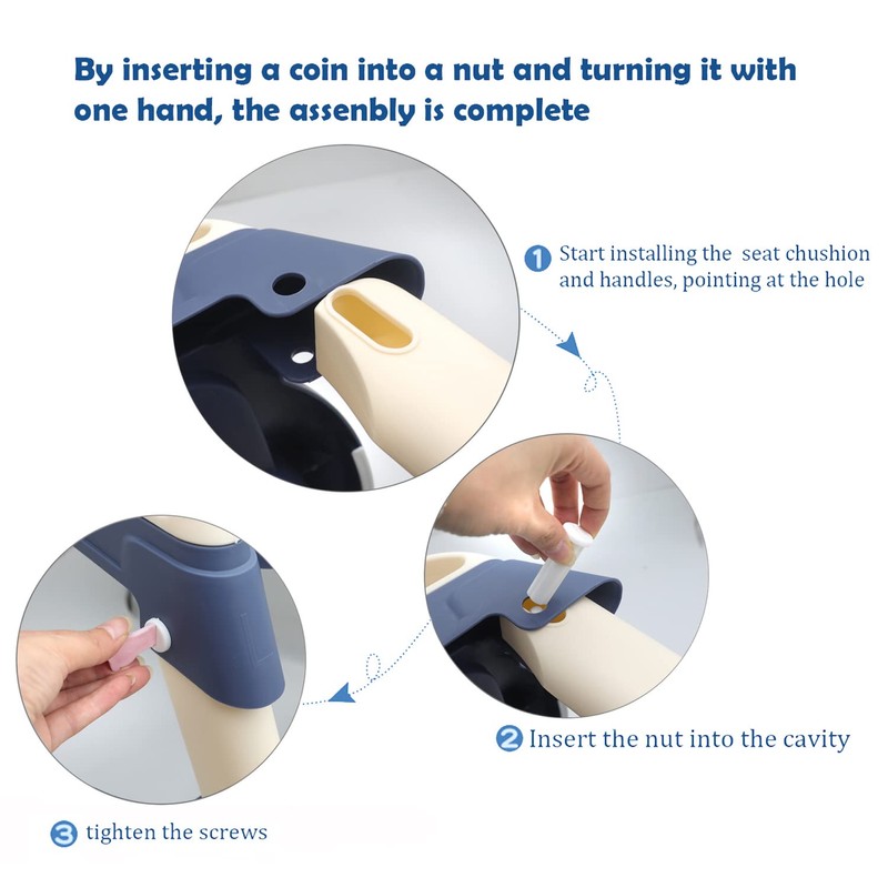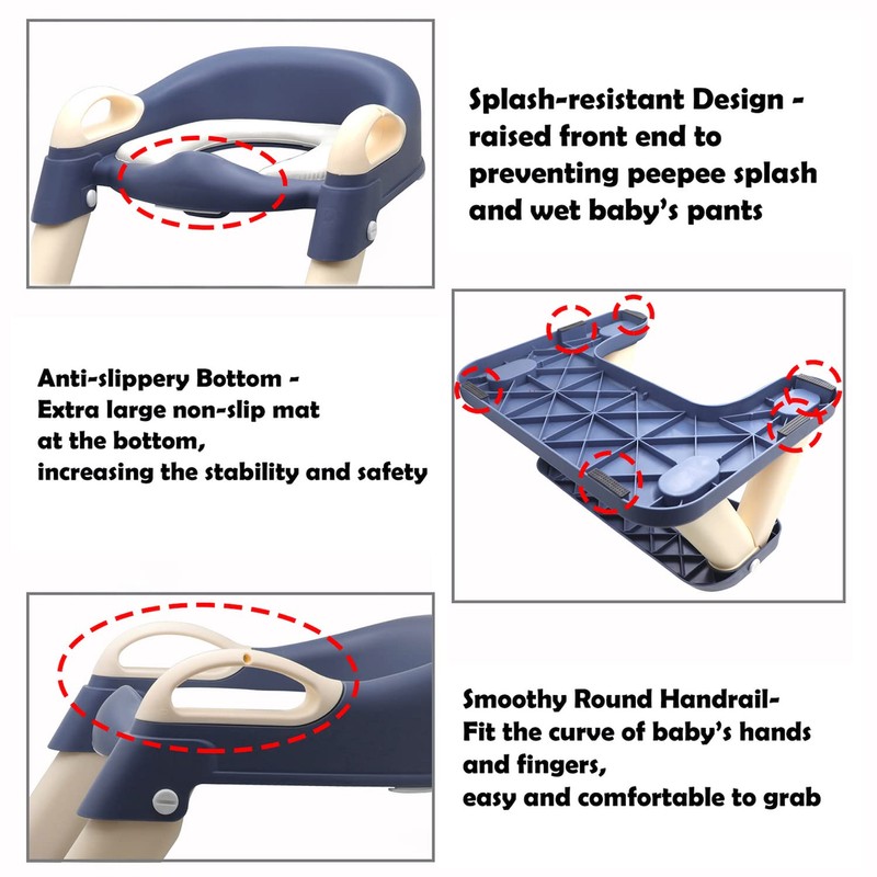 This is a useful toilet training seat for toddlers. Made of high quality material, it's sturdy and durable to use. Four Non-Slip pads on the bottom of the seat makes the seat fit an adult toilet very well and ensure your children's safety. The height of the pedal can be adjusted according to your baby's height, it's flexible and simple.