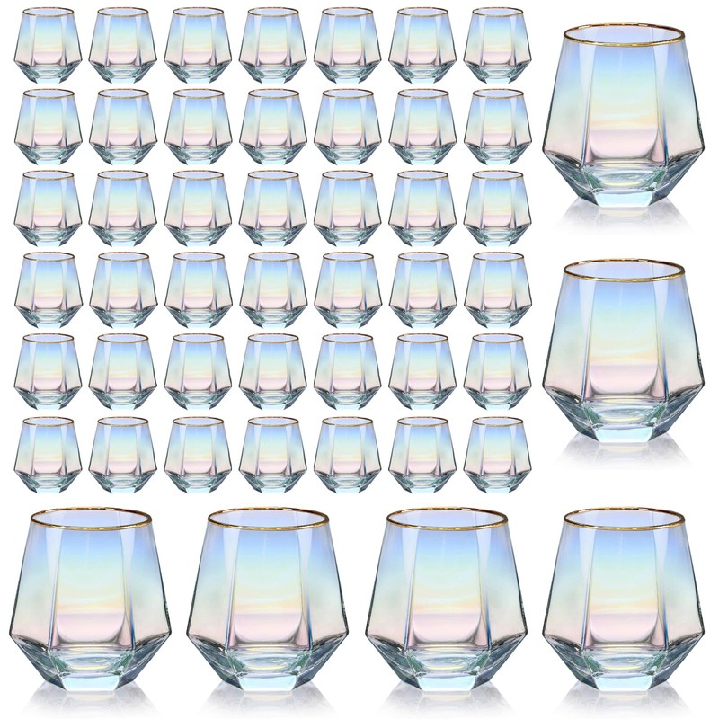 XKXKKE 48 Pcs Diamond Wine Glasses, 10 OZ Modern Stemless Gold Rim Glass Cups Iridescent Drinking Glassware for Serving Party, Home, Bar, Restaurants, Gift, Rainbow Tumbler, Colorful Set of 48