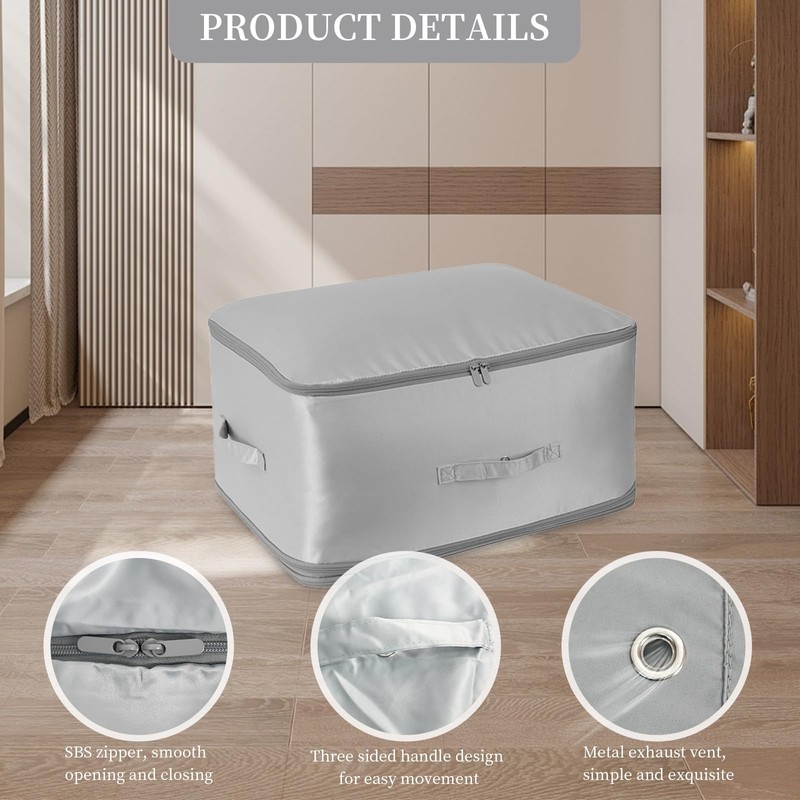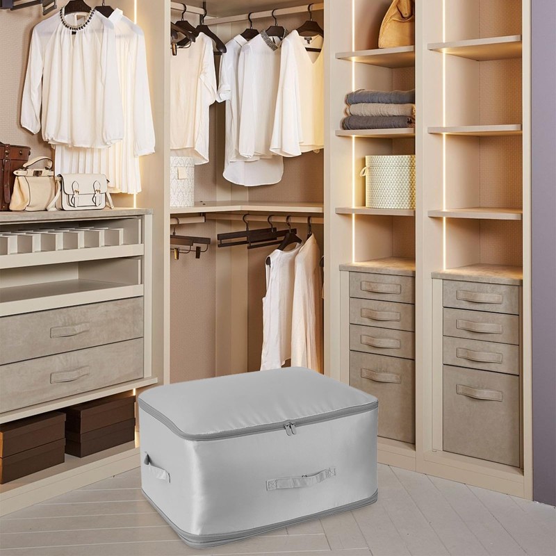 <p>Declutter your space with the Clothes Storage Box & Bedding Organizer (52x42x60cm) – your all-in-one solution for compact, secure, and stylish storage. Featuring a smart compression system, this grey storage bag dramatically reduces volume, making it perfect for closets, dorms, and travel.</p> <p> </p> <p>Crafted from smooth, water-resistant nylon, it protects your items from spills, dust, and wear. The top-opening zipper and reinforced double handles allow for easy packing, access, and transportation. When not in use, simply fold it down flat for effortless storage.</p> <p> </p> <p>Whether you're moving, organizing seasonal clothes, or traveling, this compression storage bag is the ultimate space-saver – reusable, durable, and designed for modern living.</p>