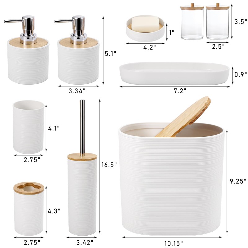 - 【10 Pieces Bathroom Accessories Set】Includes Toothbrush Holder, Toothbrush Cup, 2 Soap Dispensers, Soap Dish, Bathroom Trash Can, Toilet Brush, Tray and 2 Qtip Holders. It will help you create a complete and unified bathroom style