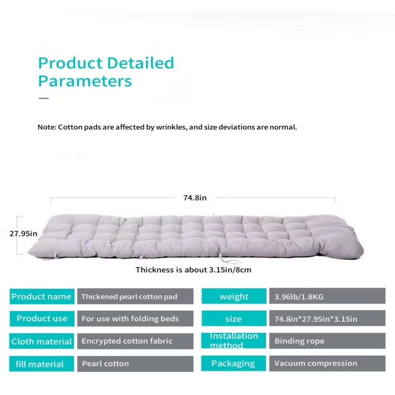 • 2. The interior of the folding mattress is made of high-quality pearl cotton. This mat provides a soft and comfortable surface that caresses your body and provides excellent support and comfort. With a thickness of 8 cm, this thickened mat is suitable for use in all seasons. Keep warm in colder weather and provide a comfortable, resilient surface in warmer weather