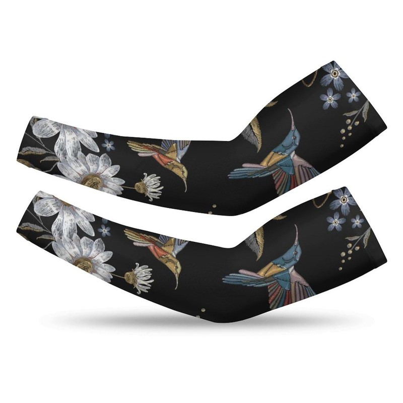 Xmkltbz 1 Pair Cooling Arm Sleeves, Unisex Warmer Spandex Sports Cover Uv Sun Protection for Cycling Golf Running M Print Humming Bird and White Chamomile Flower Embroidery on Black