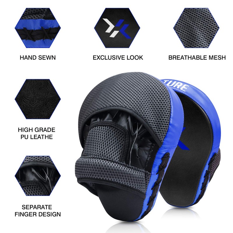 - Curved boxing pads were designed with trainer's in mind. Mesh Backing with Adjustable Wrist Strap. Helps keep hands cooler and increases breathability of the mitts.