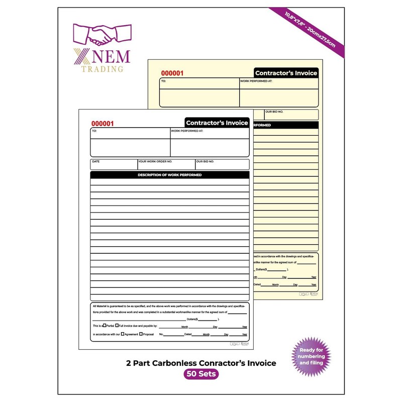 XNEM Trading 2-Part Carbonless Contractor's Invoice Book, 50 Sets, Pre-Numbered, Quality Paper, 7.8 x 10.8 Inches