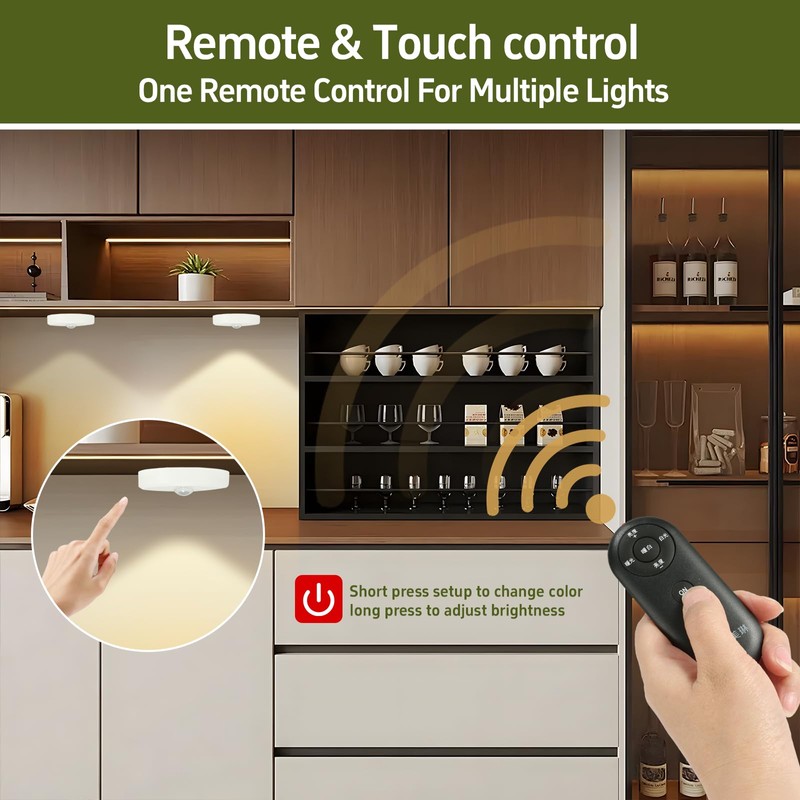 - 【3 Color Temperature & Dimmable Tap Lights】our wireless LED puck lights provides 3000K, 4500K, or 6000K and adjust brightness with stepless dimming for customized lighting.Rechargeable under cabinet lighting saves energy and money for your family.