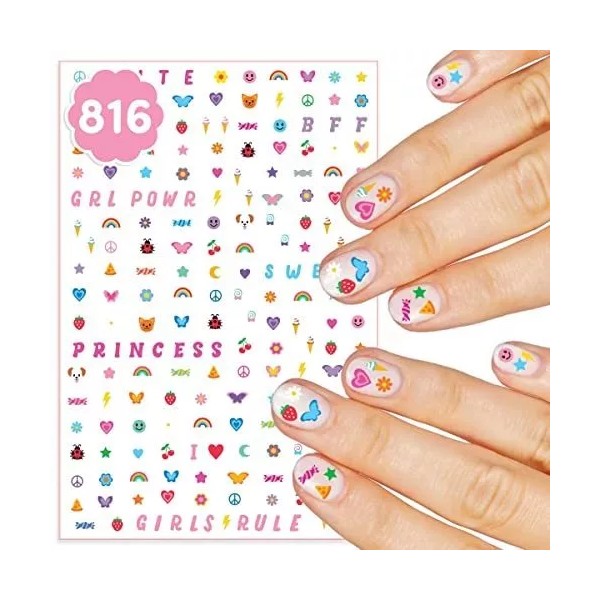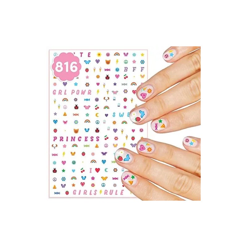 Nailed It: nos encantan las pegatinas de uñas tanto como a ti, así que les dimos un re-hacer de poder femenino :) cada juego viene con 4 hojas y 816 diseños de uñas en total Eso es más de 800 pegatinas de uñas para usted y sus bffs La mejor fiesta de la historia: va a ser el mejor cumpleaños con estas pegatinas de uñas: cada hoja mide 3 x 4 "y presenta mariposas, frutas, emoticonos, gatos, arco iris, flores + otros lindos dichos Para tus BFF: deja que tus mejores chicas se unan a la fiesta de uñas con nuestras pegatinas especialmente diseñadas para una fiesta de bday de chicas Con GRL POWR", "PRINCESS" y GIRLS RULE como opción, cada una de tus BFF tiene la oportunidad de rockear Easy Peasy Lemon Squeezy: nuestras pegatinas de uñas fueron diseñadas pensando en los padres Todo lo que necesita aplicar es un buen par de pinzas, su esmalte favorito y una capa superior fuerte :)