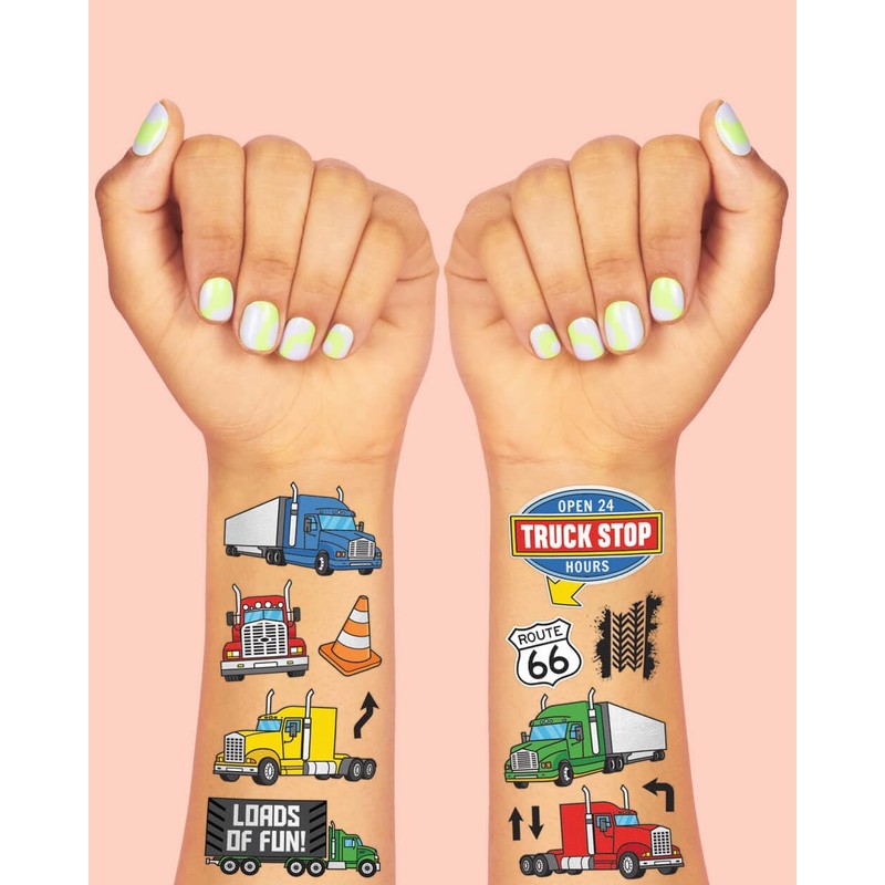 - Una rueda de buen tiempo: dos hojas con un total de 48 tatuajes de lámina plateada con diseños dibujados a mano de camiones, conos de tráfico, pistas de neumáticos, letreros interestatales y más que a los niños les encantará