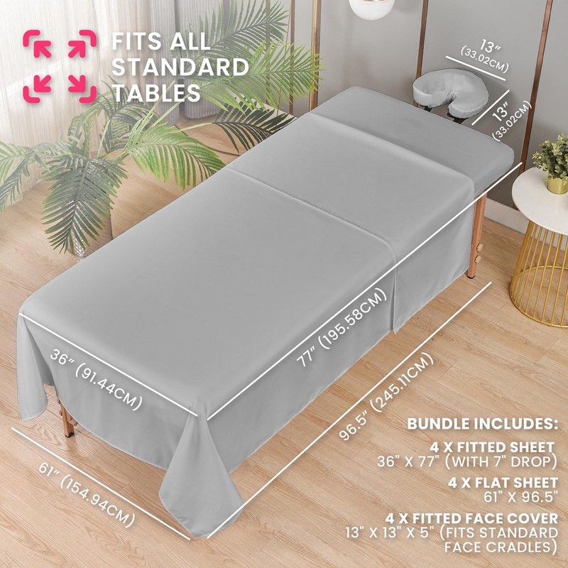 - COST-EFFECTIVE BULK BUNDLE - Each bundle contains 4 complete sets, offering exceptional value and savings. Stock up your massage practice with this economical massage bed sheets set bulk bundle, ensuring you always have fresh fitted massage table sheets on hand.