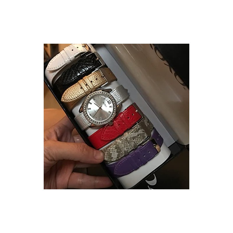 - Round watch in silver-tone case featuring crystal-set bezel and seven interchangeable bands