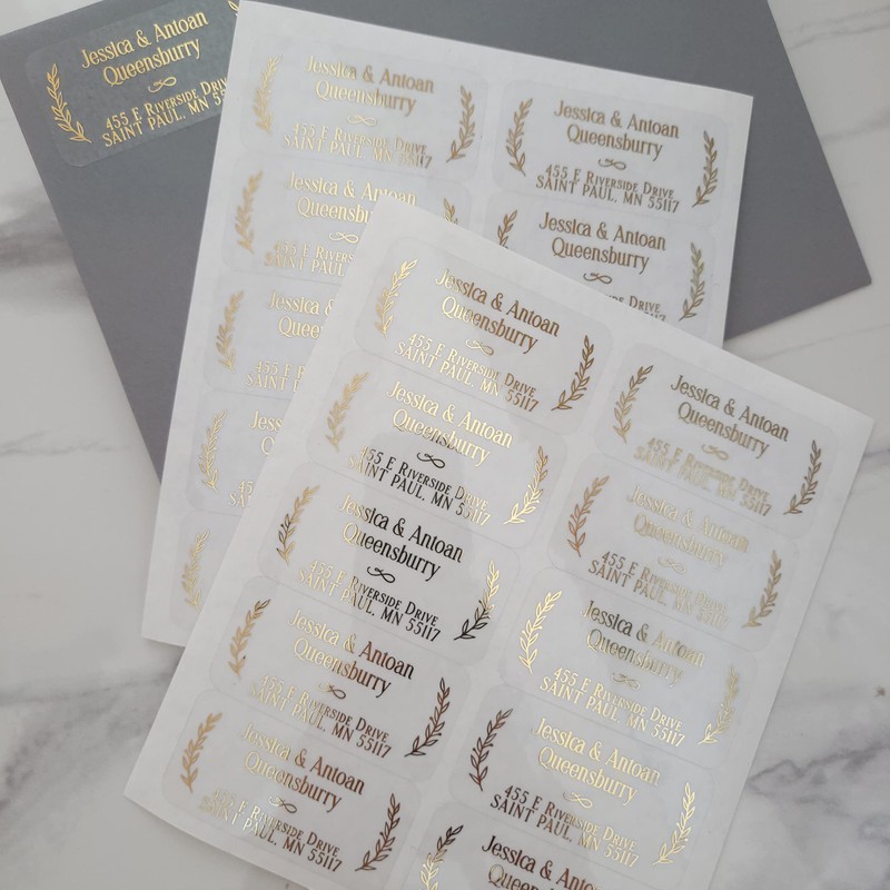 • You can choose between gold, rose gold, or silver foil and classic black ink to match the labels to your envelopes or party theme.