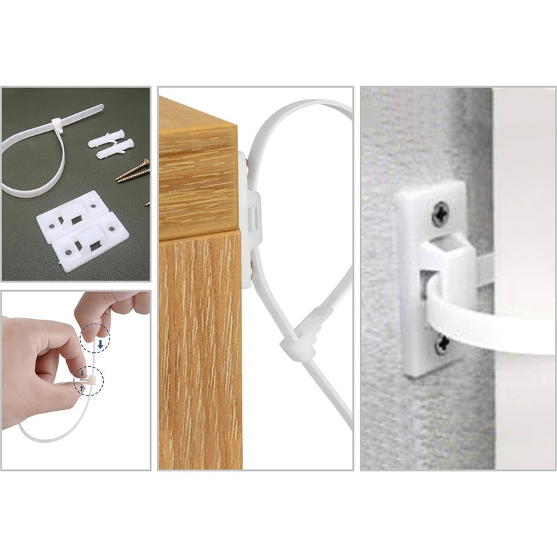 Screw the attached brackets on the back or side of your furniture or fixture, and attach the adjustable nylon ties / straps to allow furniture to move together in place during earthquake sways.