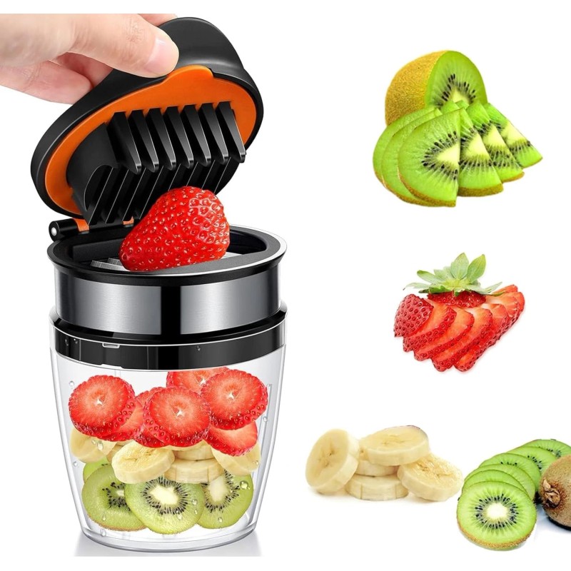 - Easy To Use: Just put the strawberry on the sharp blades and aim at the strawberry, press the lids down to slice the strawberry to the cup below. Quick slice with one press ergonomic lid. Creative hand-press strawberry fruit slicer is great for saving time in the kitchen!