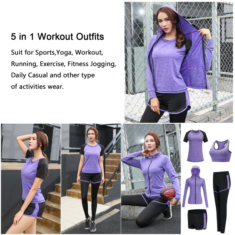 XPINYT 5pcs Workout Outfits for Women Athletic Sets Sport Suits Yoga Gym Fitness Exercise Clothes Jogging Tracksuits(Purple,M)