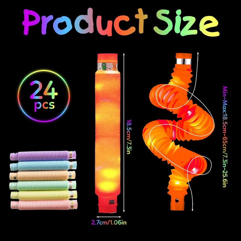 - The 24 LED pop tubes fidget toy are shipped in mixed colors, and there may be more or less of some colors, which is normal.