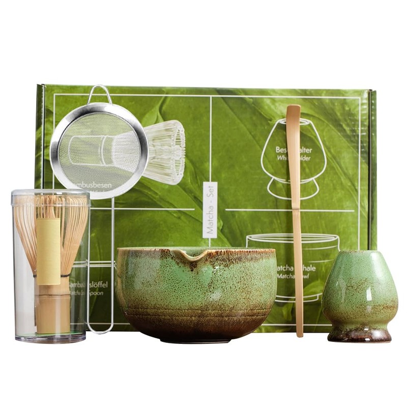 Our 5 piece matcha whisk set comprises a matcha whisk, a matcha spoon, a ceramic matcha bowl, a matcha powder sieve, and a ceramic matcha whisk stand. Matcha whisk set can satisfy most of your matcha beverage production.